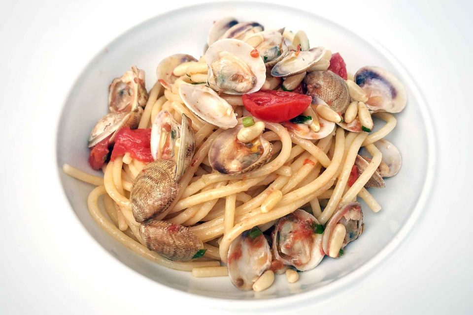 Spaghetti con le vongole. La ricetta è perfetta con pinoli e datterini