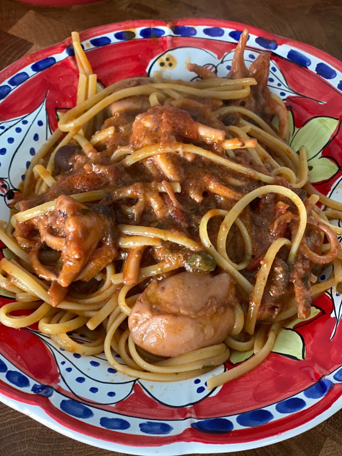 Un primo piatto tipico della cucina romana che è povera e spesso piccante. In una padella antiaderente versa l'olio extra vergine di oliva, sbriciola uno o due diavoletti (peperoncino secco) a seconda del tuo gusto, e fai soffriggere dolcemente insieme a uno spicchio d'aglio diviso a metà. La pasta con alici fresche alla romana è una variante della più conosciuta pasta aglio olio e peperoncino arricchita con le alici.